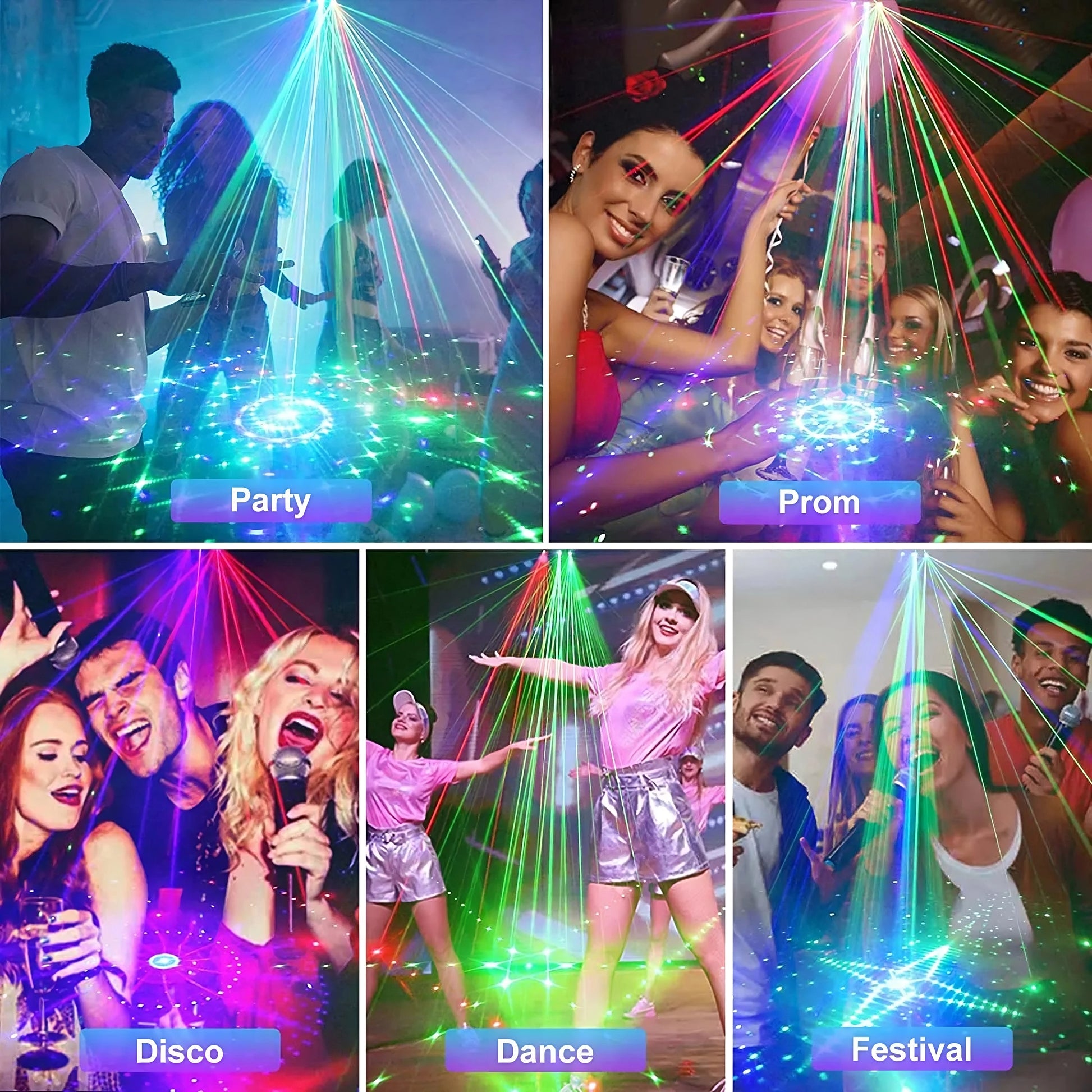 21 Lens output can project super bright LED Light(Red,Green,Blue,Purple),6 lens RGB Beam light with Various bright and colorful patterns,buit in high sensitivity voice control sensor,pattern, color & beam effects can changes with the beat of music,creating a unforgetable disco light show for your party