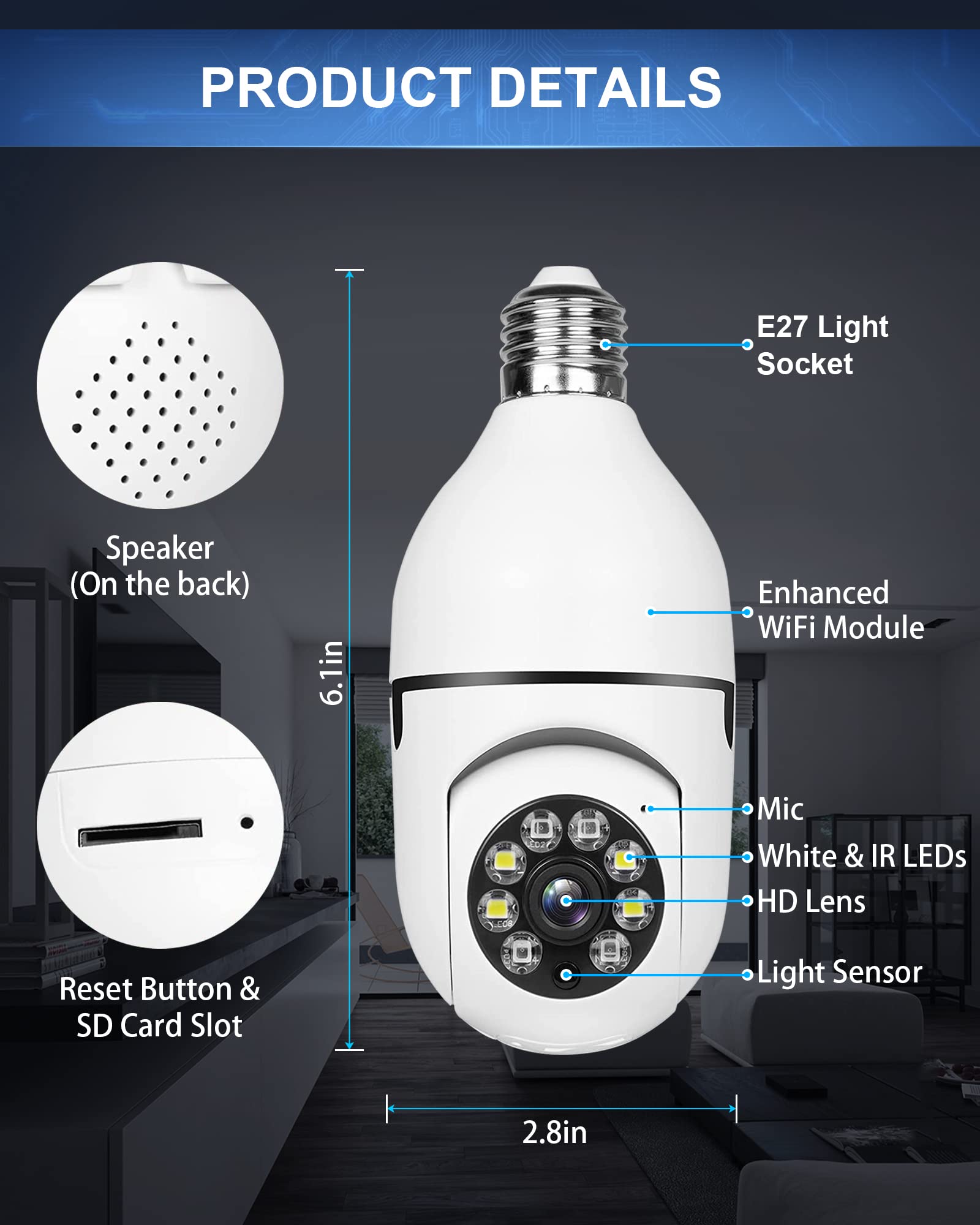 Featuring advanced infrared night vision, this bulb camera ensures you never miss a detail, even in pitch-black darkness. Protect your home 24/7 with sharp, high-definition footage, day or night!