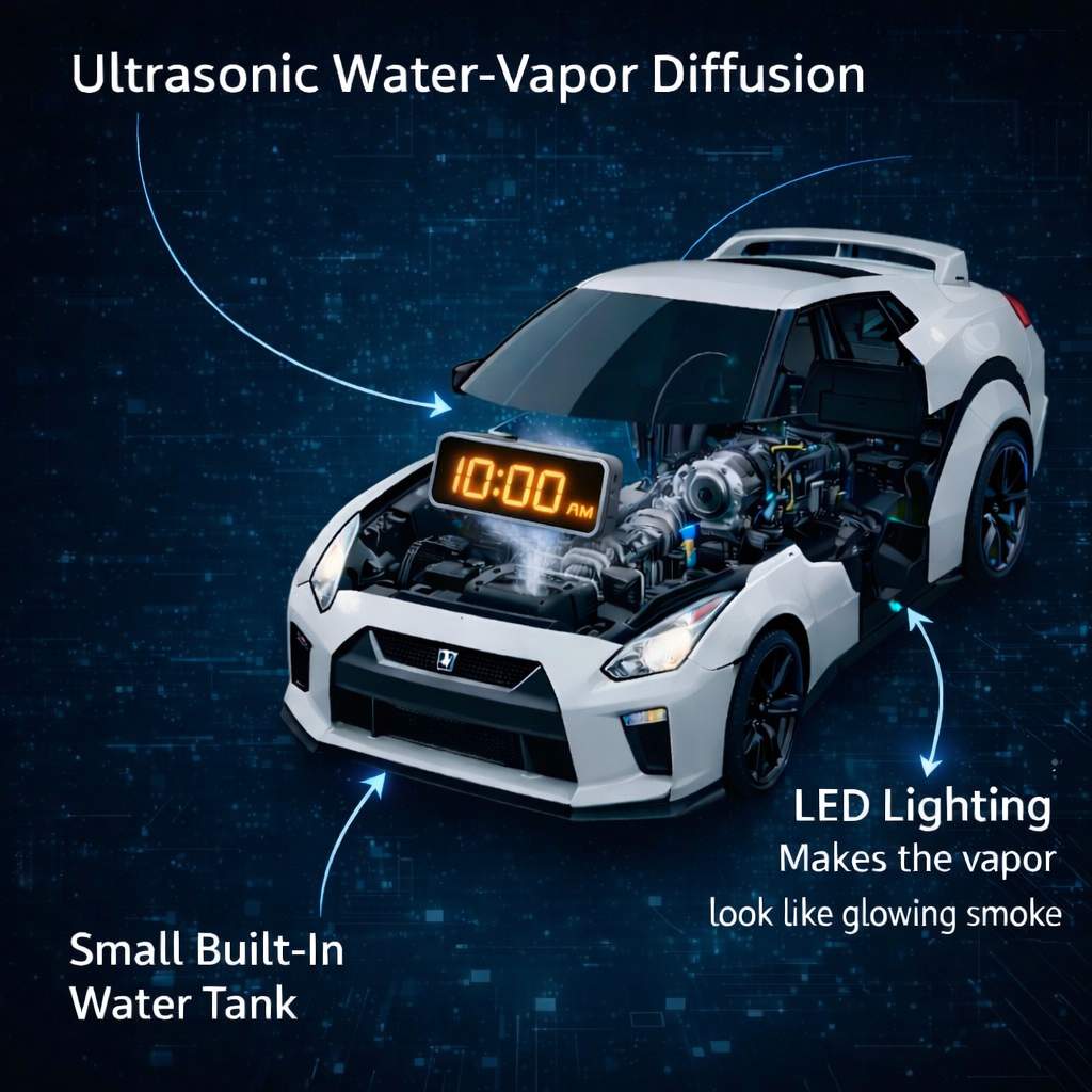 The eye-catching exhaust “smoke” effect uses advanced ultrasonic water-vapor diffusion — not heat, not real smoke, and no burning elements.