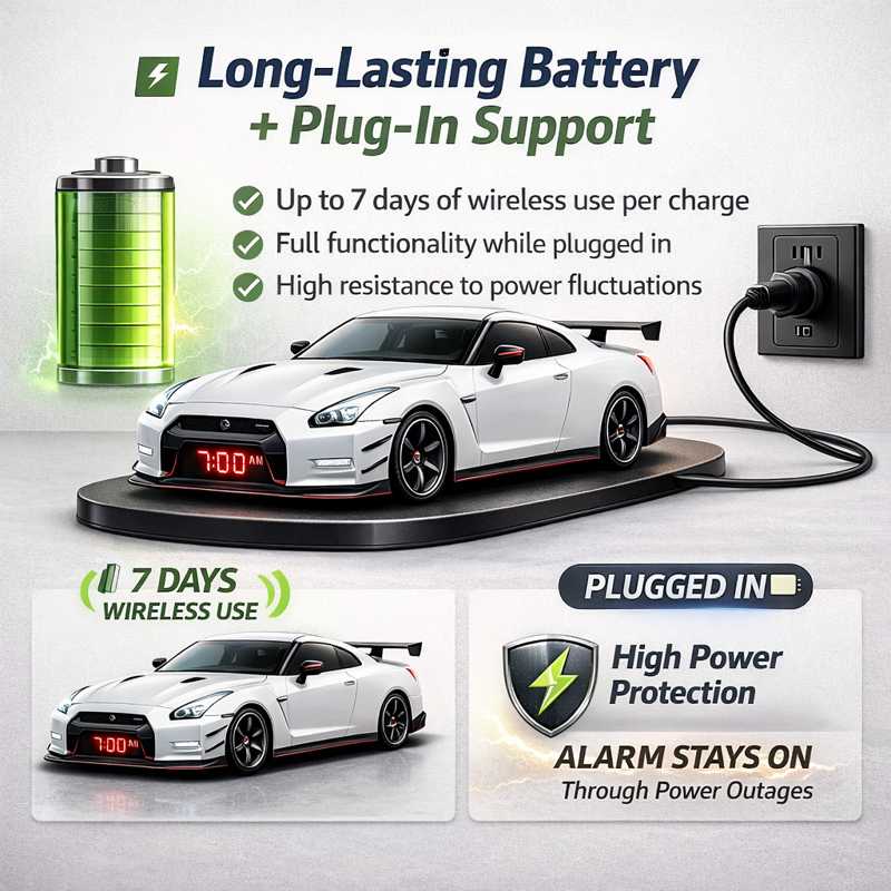 From authentic engine-start alarms and glowing exhaust vapor effects to dual LED displays and tap-to-snooze control, this is more than an alarm clock — it’s an automotive statement.